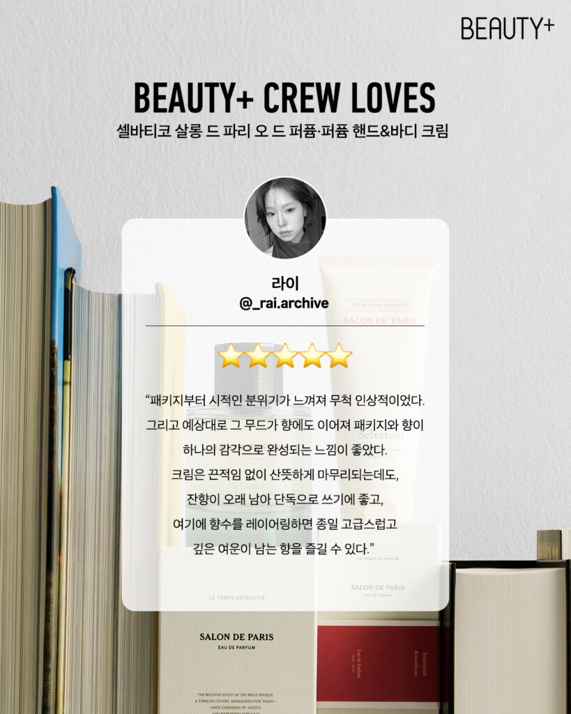 “우아한 플로럴과 머스크가 은은하게 어우러져 깊은 여운을 남긴다. 차분하면서도 세련된 분위기로 하루 종일 곁에 머물러 요즘 손이 가장 자주 가는 제품. 같은 향의 핸드크림과 함께 쓰면 잔향이 한층 부드럽고 풍성해진다. 벨 에포크 살롱의 우아한 공기를 담아낸 듯한 무드, 그리고 선물하고 싶을 만큼 아름다운 패키지까지. 취향과 감성을 함께 전하고 싶은 순간에 추천하고 싶은 제품.” – 신소여(@soyeo)