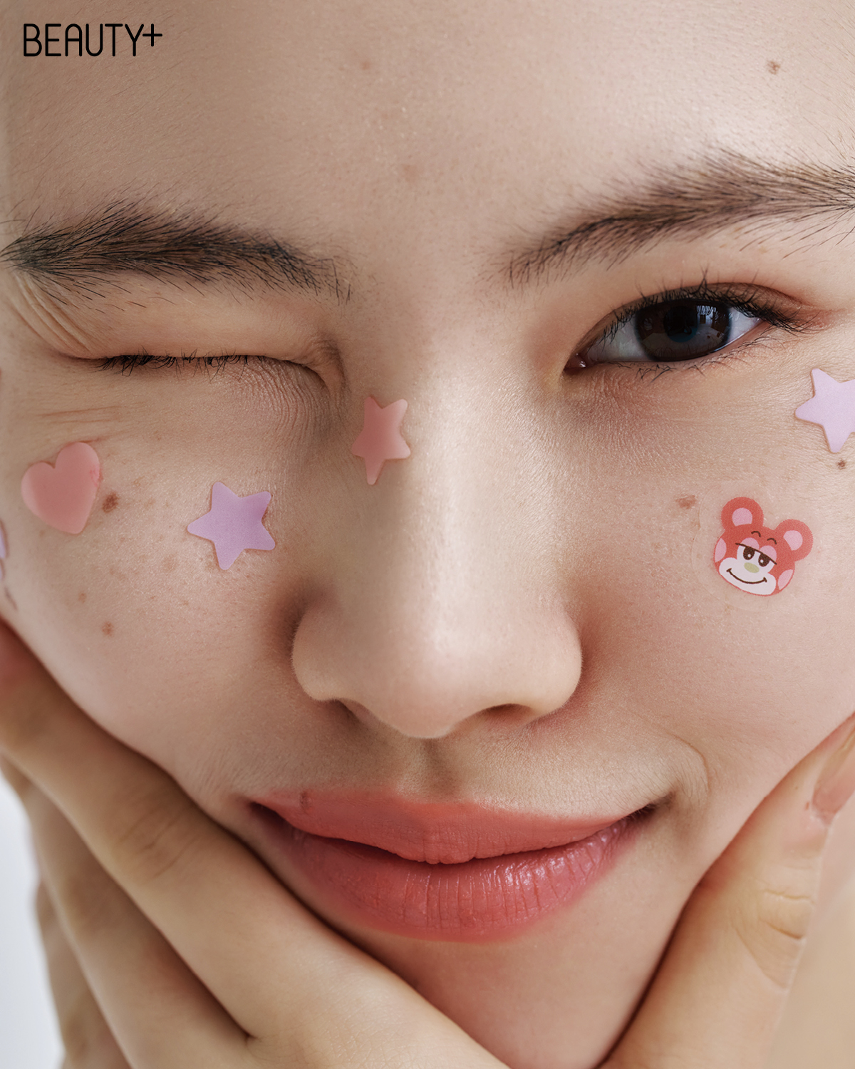 여드름이 터지기 전 붉은 부위를 진정시키는 티트리 & 병풀 추출물 패치는 귀여운 캐릭터 모양으로, 여드름이 터진 후 흔적을 케어하는 진정 패치는 사랑스러운 패턴으로 제작했다.