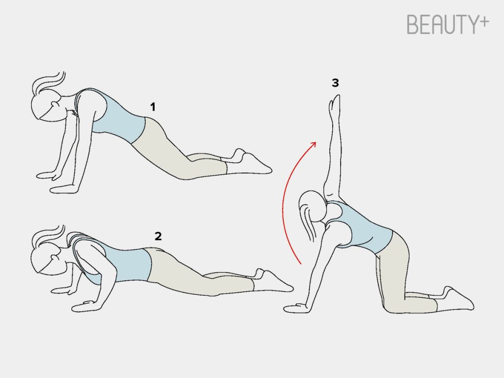3 몸통을 비틀면서 한쪽 팔을 천장을 향해 뻗는다. 2번 자세로 돌아와 푸시업 후 반대도 동일하게 진행하며 반복한다.