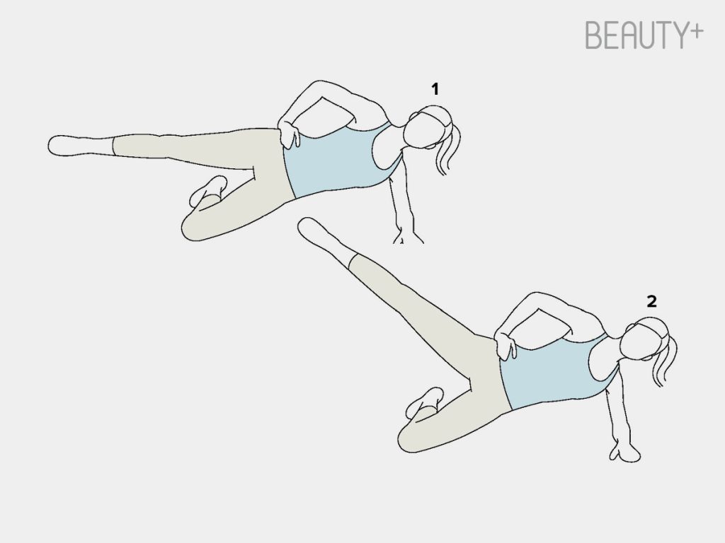 2 몸통이 일직선이 되도록 사이드플랭크 자세를 만든 후 위쪽 다리를 최대한 올렸다가 내려주기를 20초 반복할 것. 자세를 반대로 바꾸어 20초 더 진행한다.