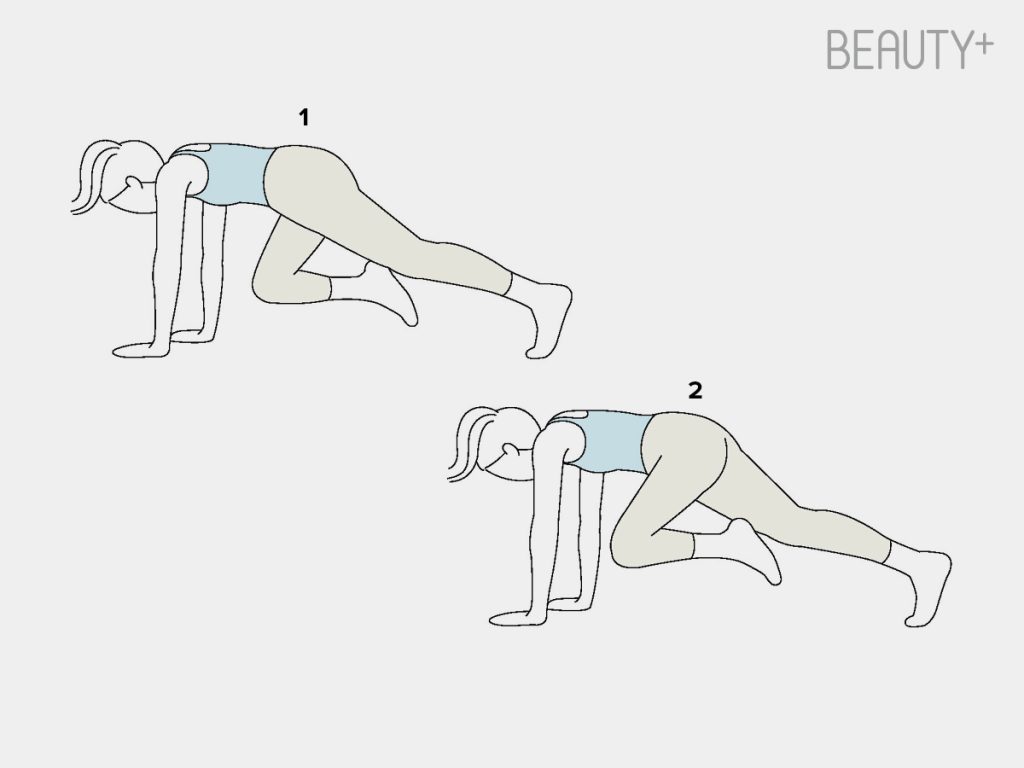 1 플랭크 자세로 준비한다. 몸 전체를 일직선으로 유지하고 허리가 꺾이지 않도록 복부에 힘을 줄 것. 그 상태에서 한쪽 무릎을 가슴 쪽으로 빠르게 끌어당긴다.