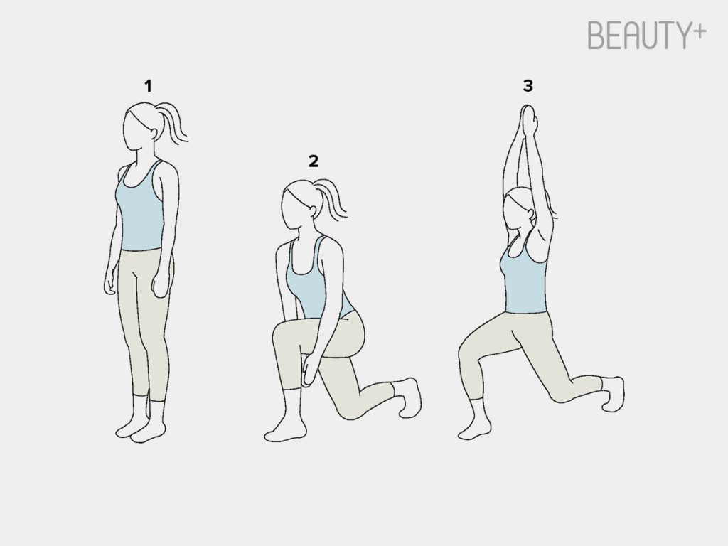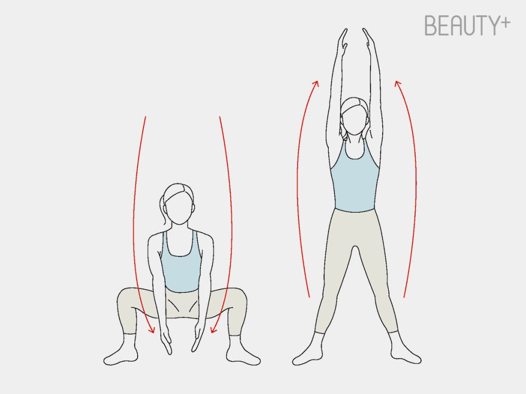 2 일어나면서 팔을 머리 위로 올린다. 리듬감 있게 40초 반복 후 20초 휴식.