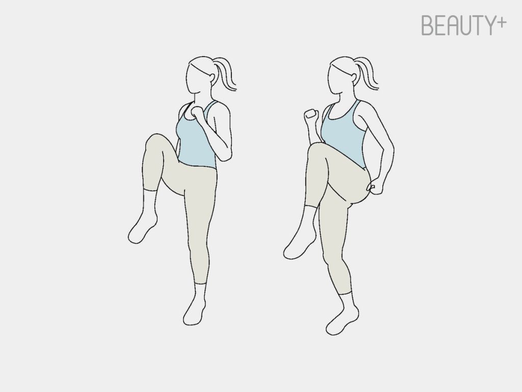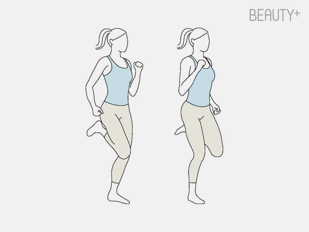 바로 선 자세에서 한쪽 무릎을 90도 이상 들어 올린다. 팔은 앞뒤로 자연스럽게 흔들면서 균형을 맞추고 좌우로 교차하며 천천히 걷듯 반복한다. 초보자는 점프 없이, 중급자 이상은 가볍게 점프하며 실시.