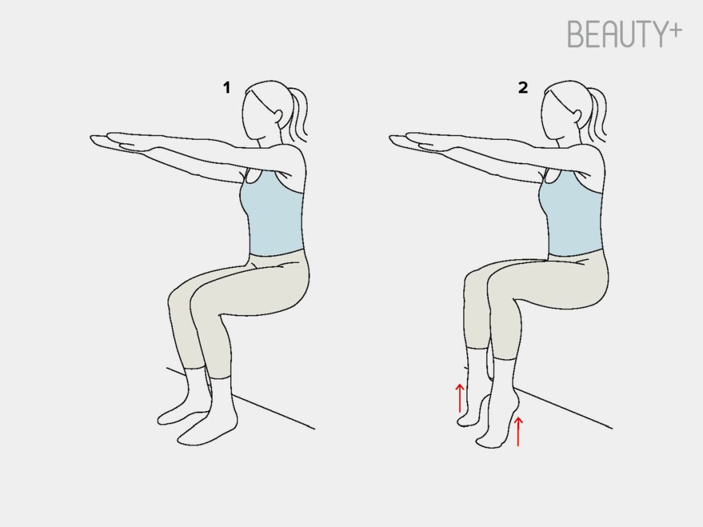 2 1번 자세를 유지한 채 양발 뒤꿈치를 동시에 올려준다. 뒤꿈치를 천천히 올렸다가 내리는 것을 40초 반복.