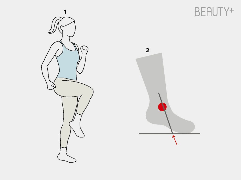 두 발로 선 자세에서 제자리 점프를 하며 뒤꿈치가 엉덩이에 닿도록 무릎을 접어 올린다. 이때 팔은 리듬에 맞춰 앞뒤로 자연스럽게 흔들어 반동을 만들고, 앞꿈치로 착지하면서 가볍게 뛸 것.
