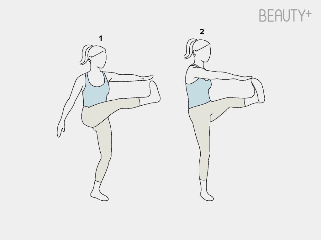 1 다리를 앞쪽으로 차올리며 반대 손으로 발끝을 터치한다.