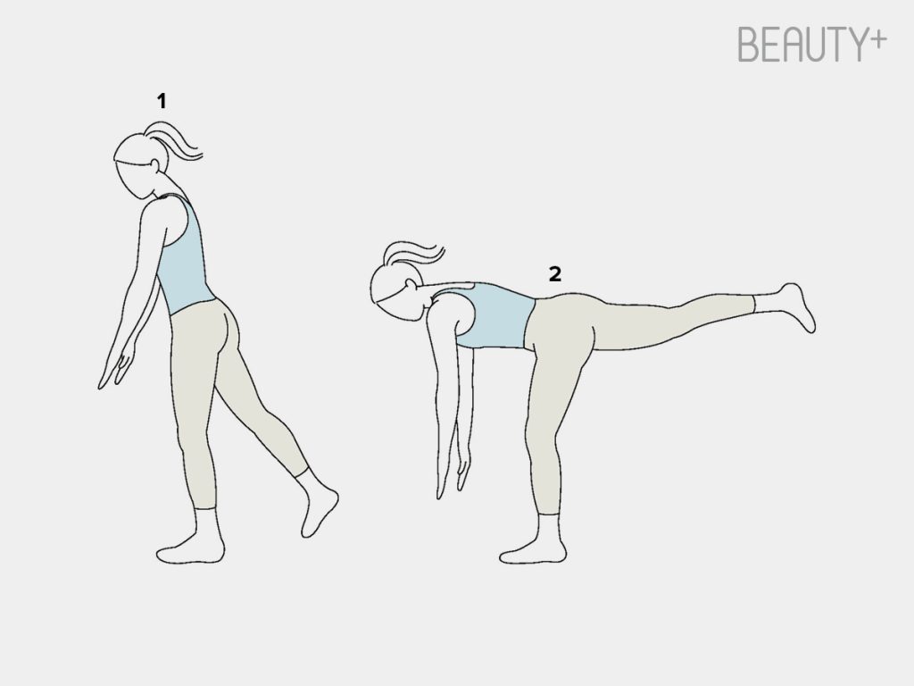 1 양발을 골반 너비로 벌리고 선 뒤, 한쪽 다리를 뒤로 뻗으며 상체를 앞으로 숙인다. 양손은 바닥을 향해 뻗는다.