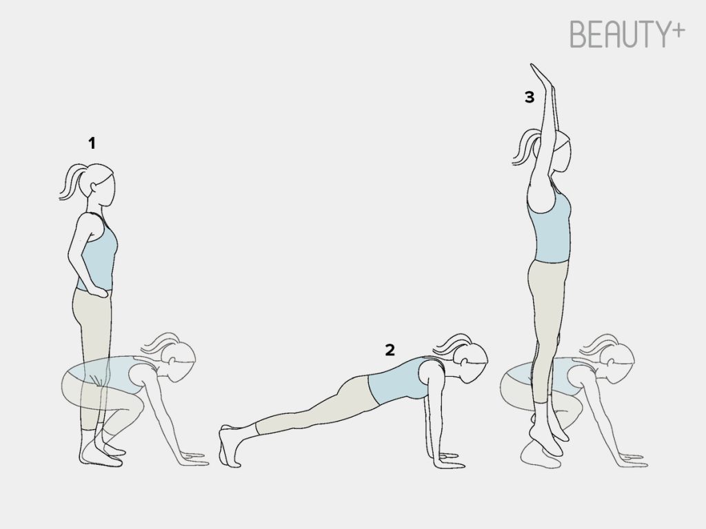 3 다시 두 다리를 앞으로 끌어오고 가볍게 점프하며 일어나는 것이 마지막 자세. 이를 40초 반복하되 플랭크 자세에서 허리가 너무 꺾이지 않게 하고, 손목이나 무릎에 통증이 있다면 속도를 늦춰서 진행한다.