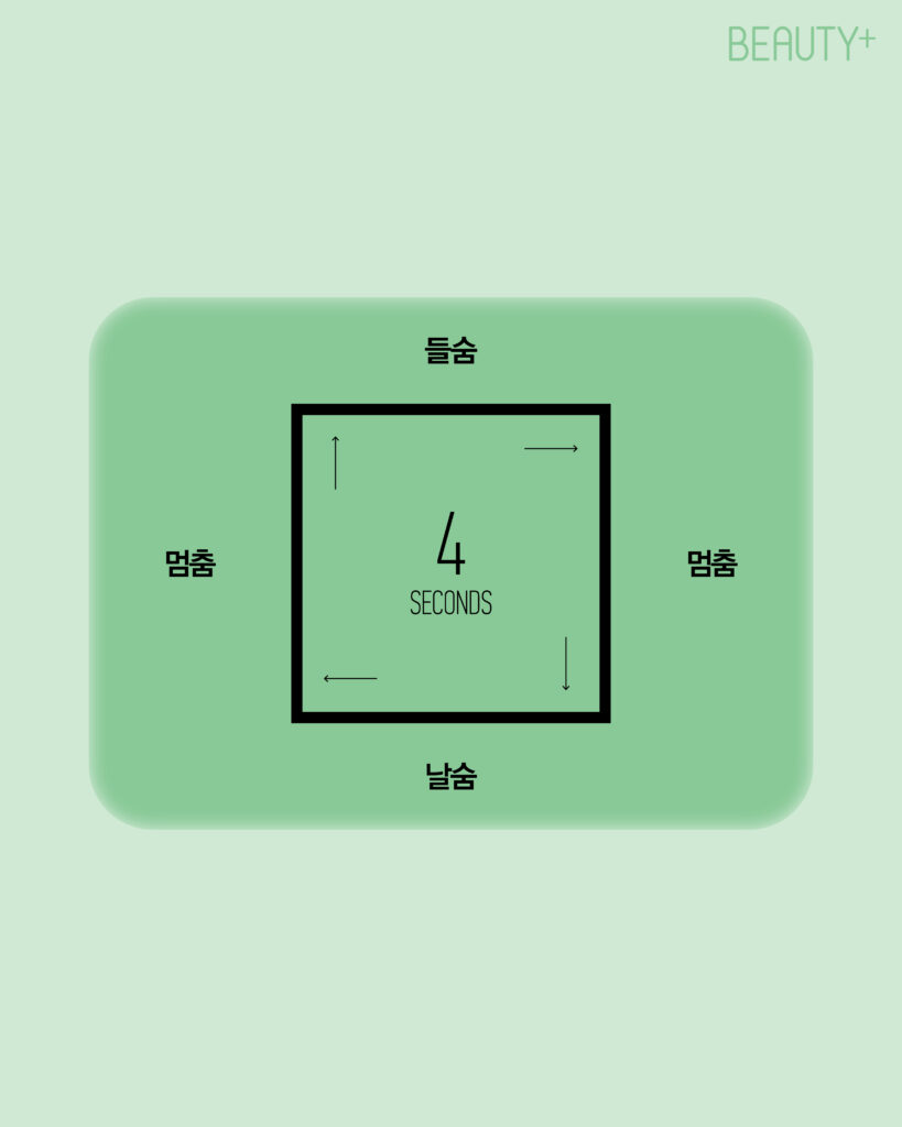 4초 들숨, 4초 멈춤, 4초 날숨, 4초 멈춤을 반복하는 이 호흡법은 불안정한 심박수와 요동치는 감정을 잠재우는 데 탁월하다. 짧은 시간 안에 집중력 회복과 스트레스 조절 효과가 커서 긴장되는 회의 전이나 감정이 흔들릴 때 반복하면 좋다.