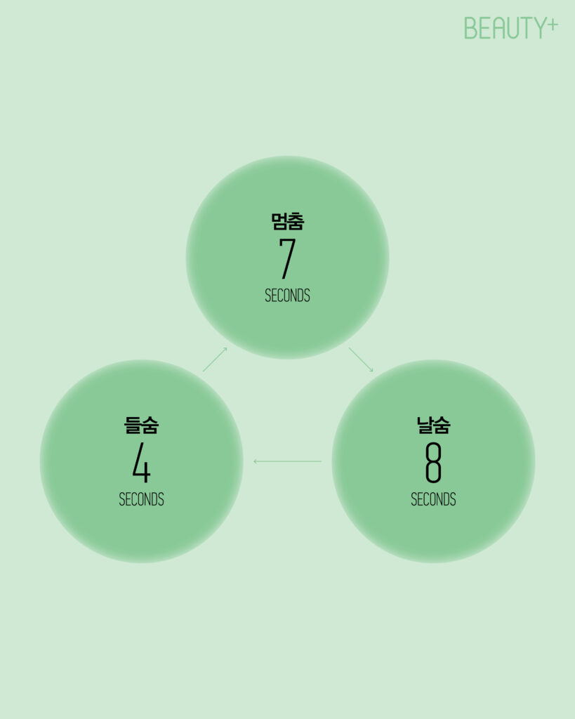 4초 들이쉬고, 7초 동안 멈춘 뒤, 8초에 걸쳐 가늘게 천천히 내쉰다. 이 간단한 호흡법이 부교감신경을 빠르게 활성화해 신경계의 흥분 상태를 진정시키고 수면 유도를 돕는다. 몸은 고단한데 머리는 계속 깨어 있을 때, 잠자리에 누워 이 호흡을 4~5회만 반복해도 몸의 이완을 즉각적으로 체감할 수 있다.